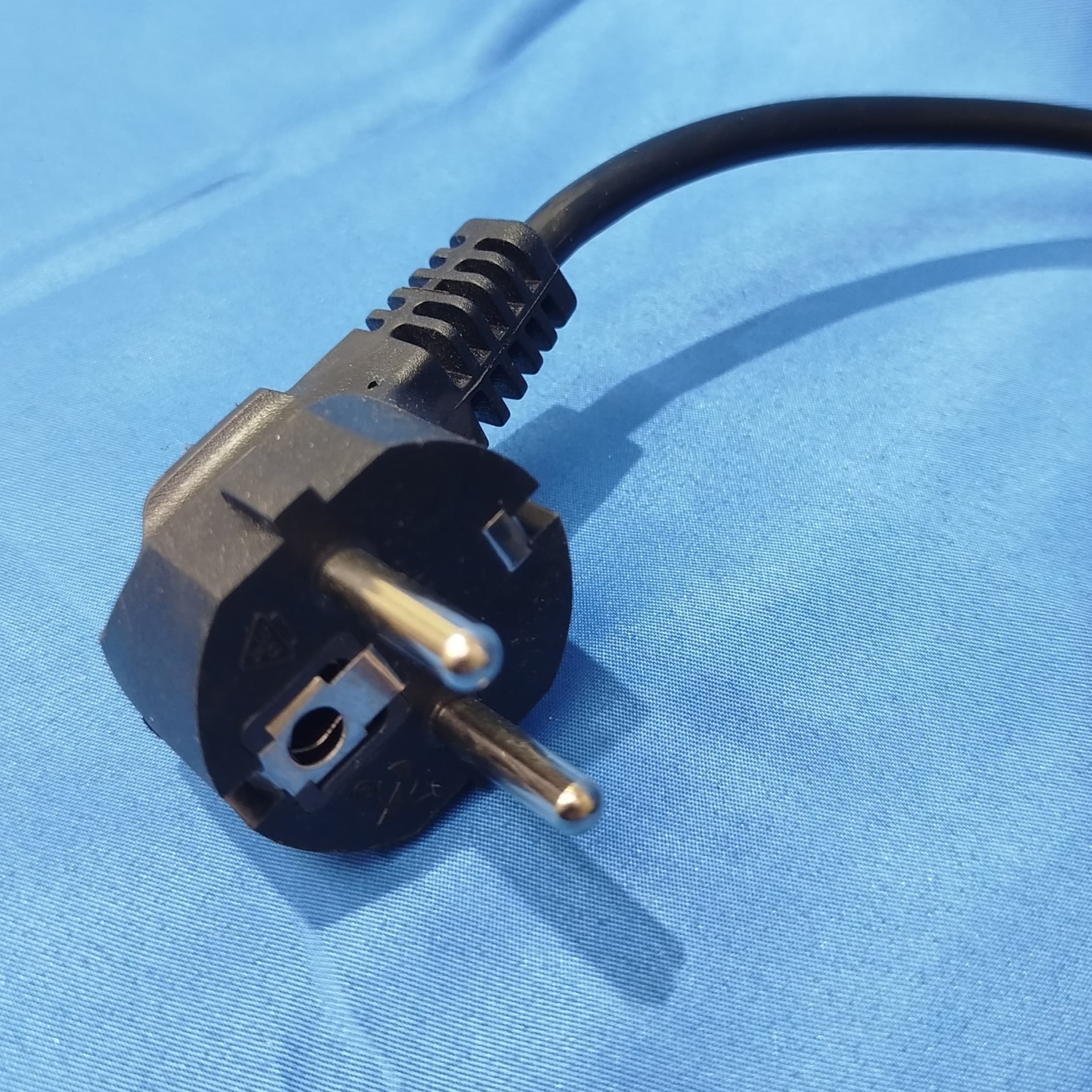 Cabo elétrico preto com conector de três pinos sobre fundo azul