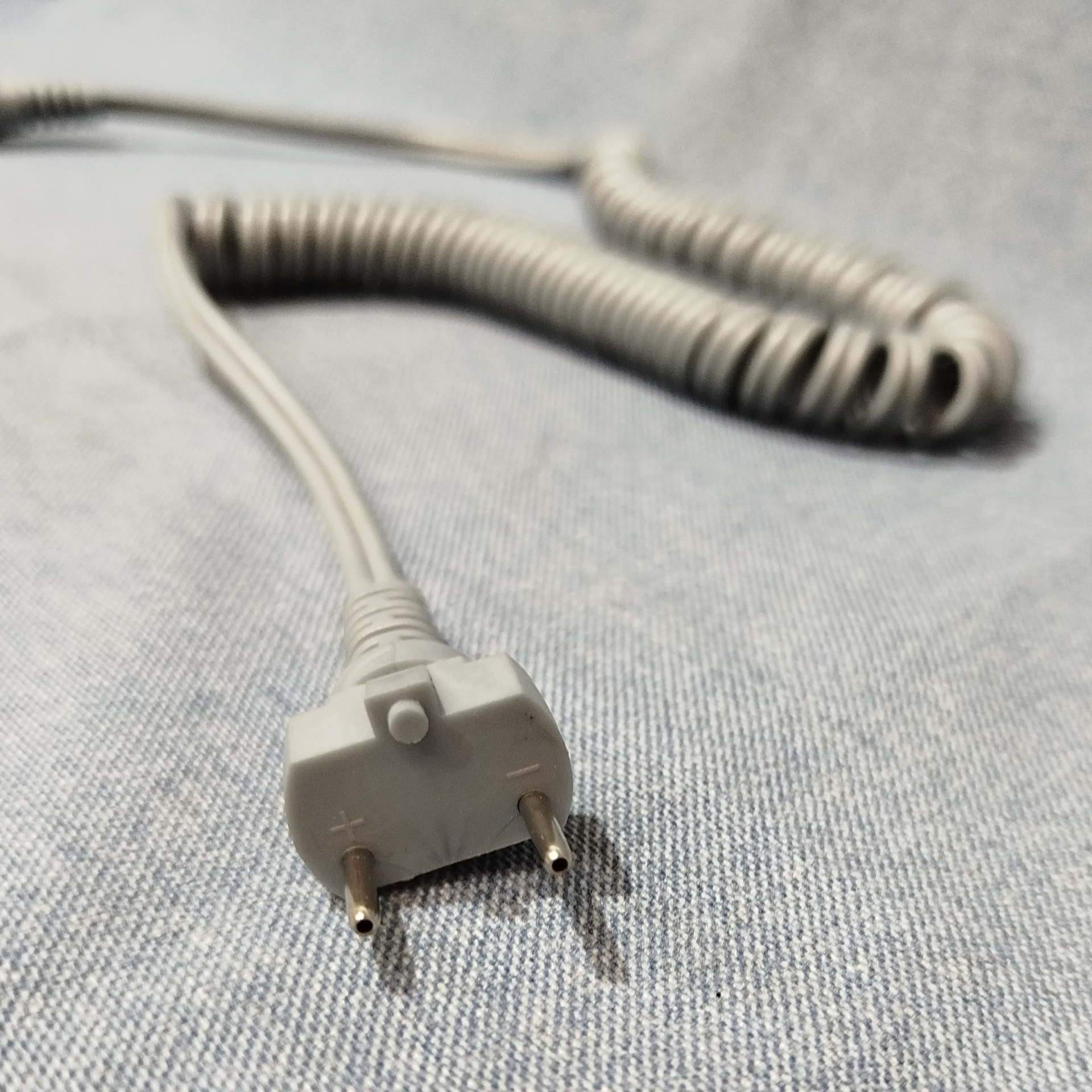 Cabo elétrico cinzento enrolado com conector circular e ficha de três pinos sobre tecido azul-claro