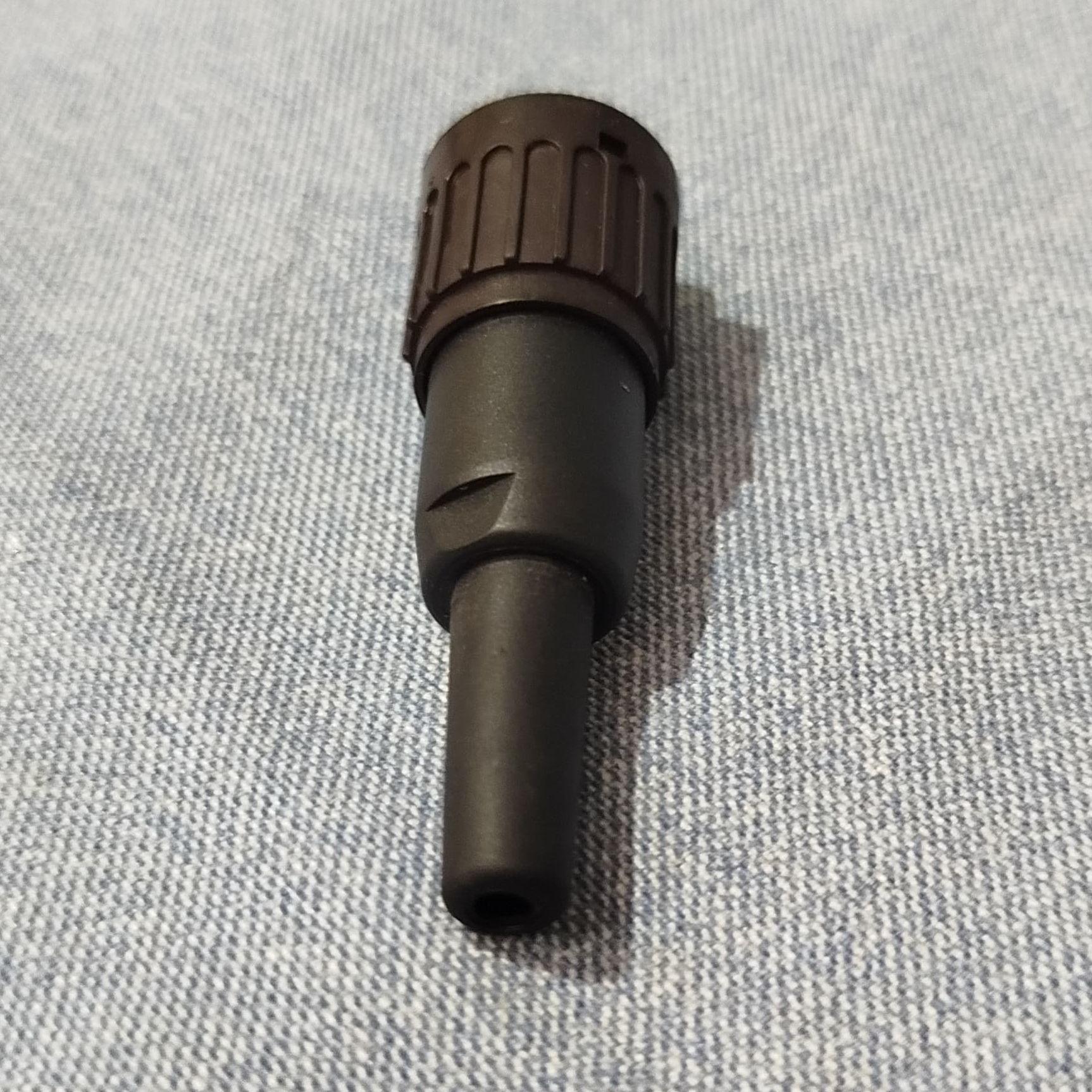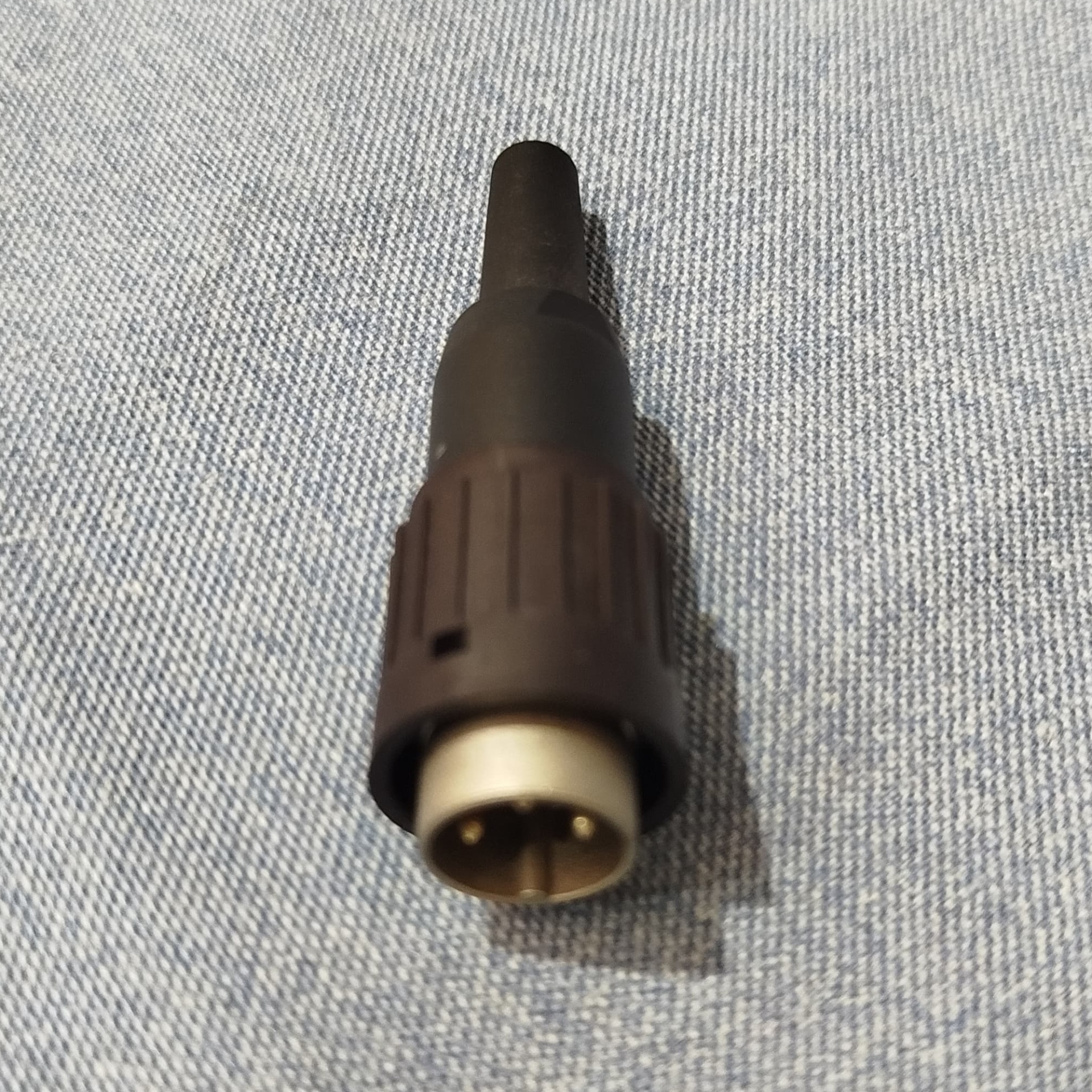 Conector preto com três pinos metálicos sobre tecido cinzento
