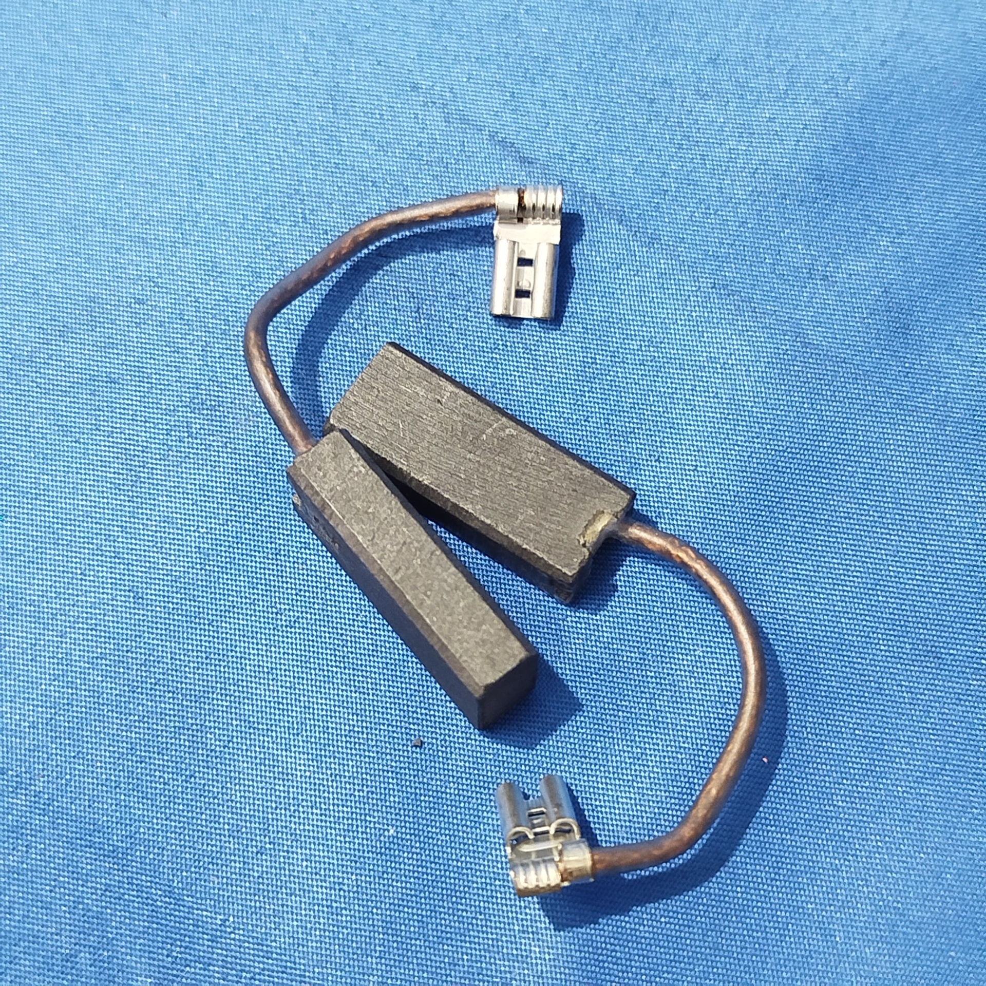 Escovas de carvão com cabos e terminais metálicos sobre fundo azul