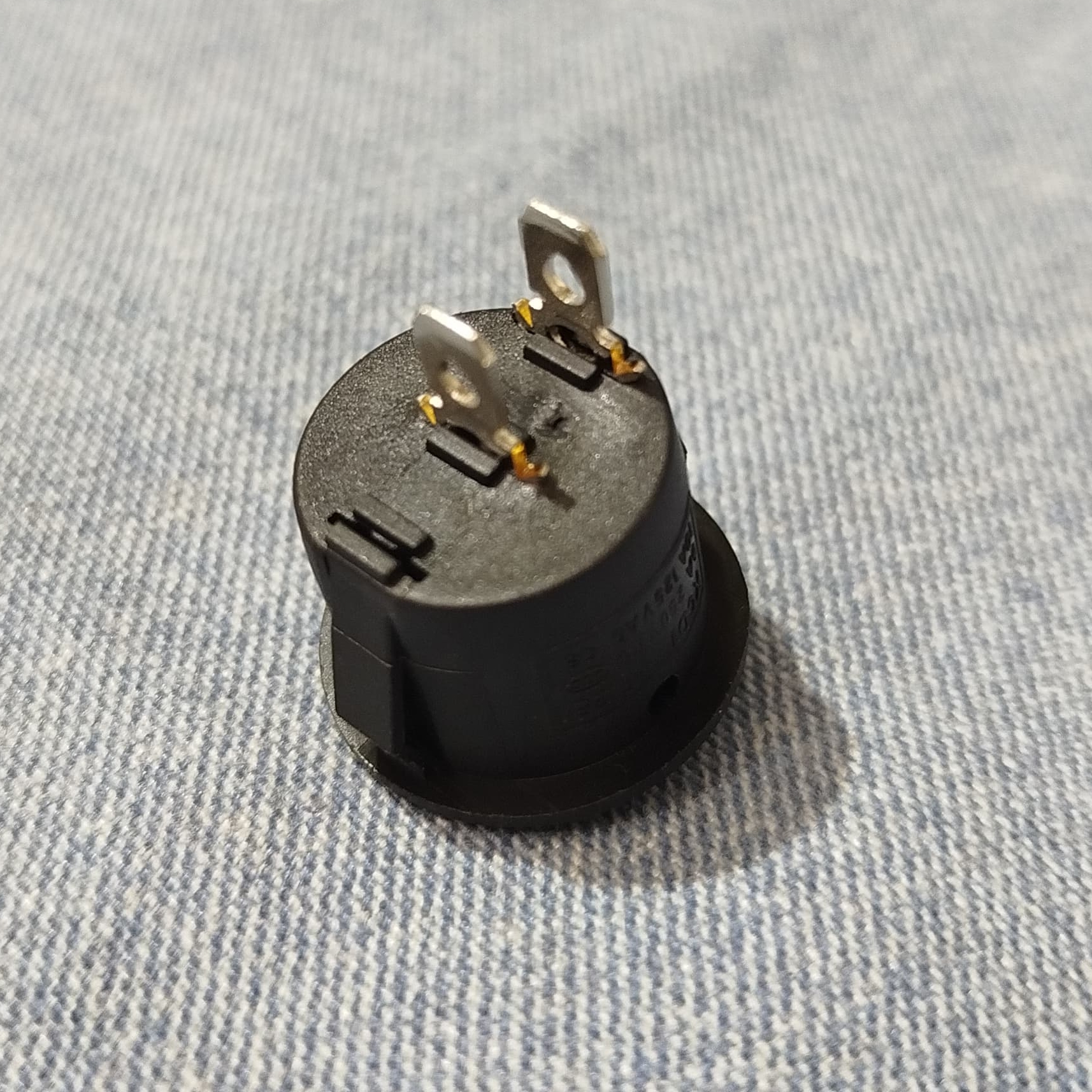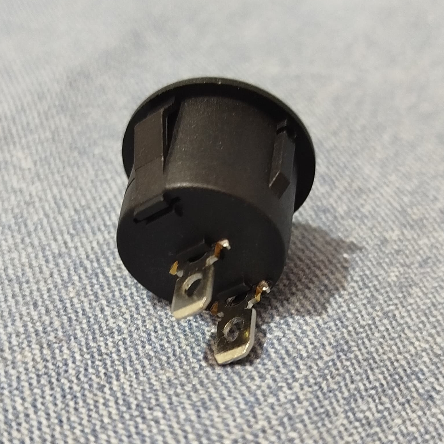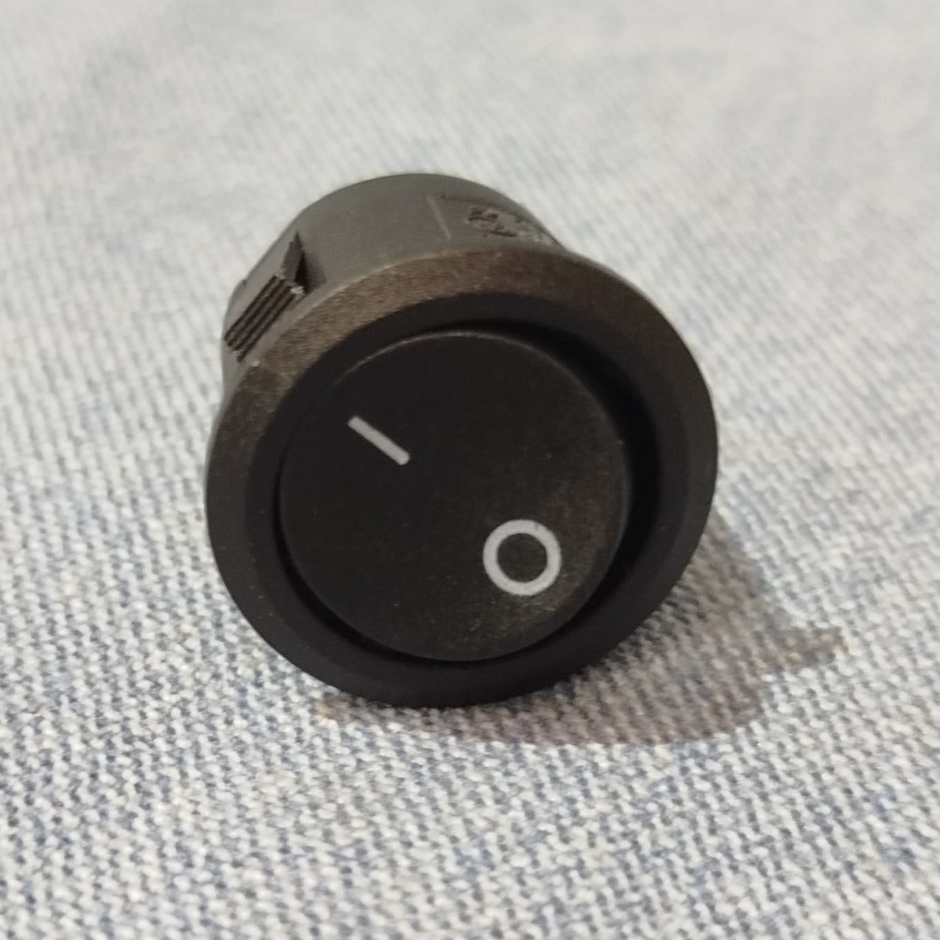 Interruptor redondo preto com símbolos I e O num tecido cinza claro