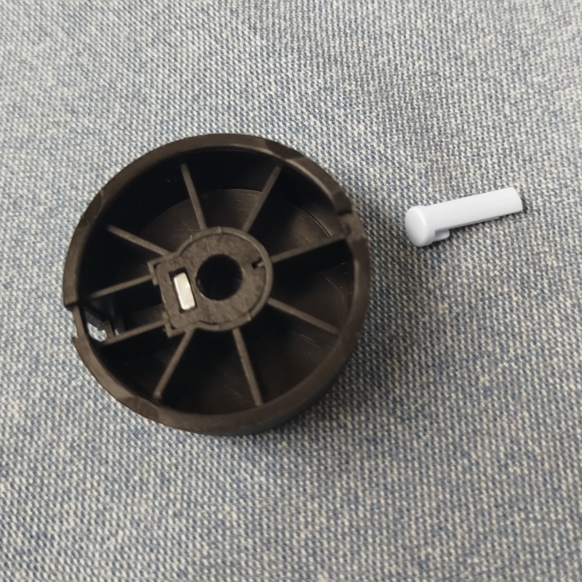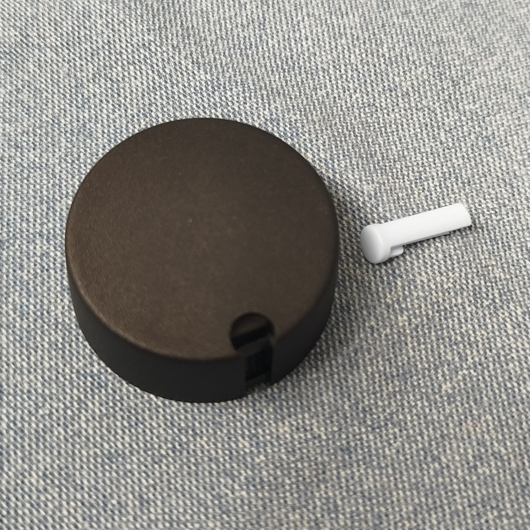 Peça plástica redonda preta com parafuso branco sobre tecido azul claro