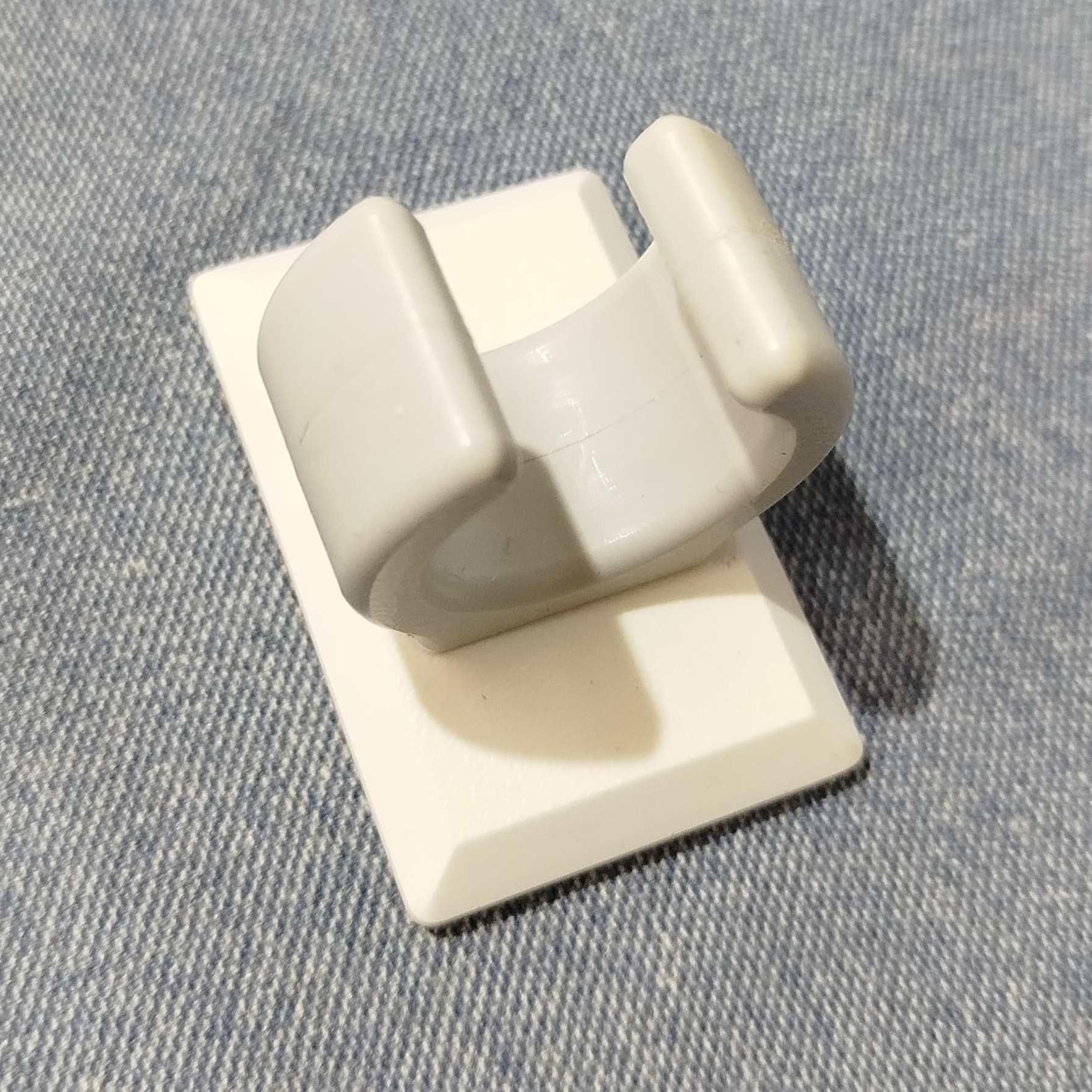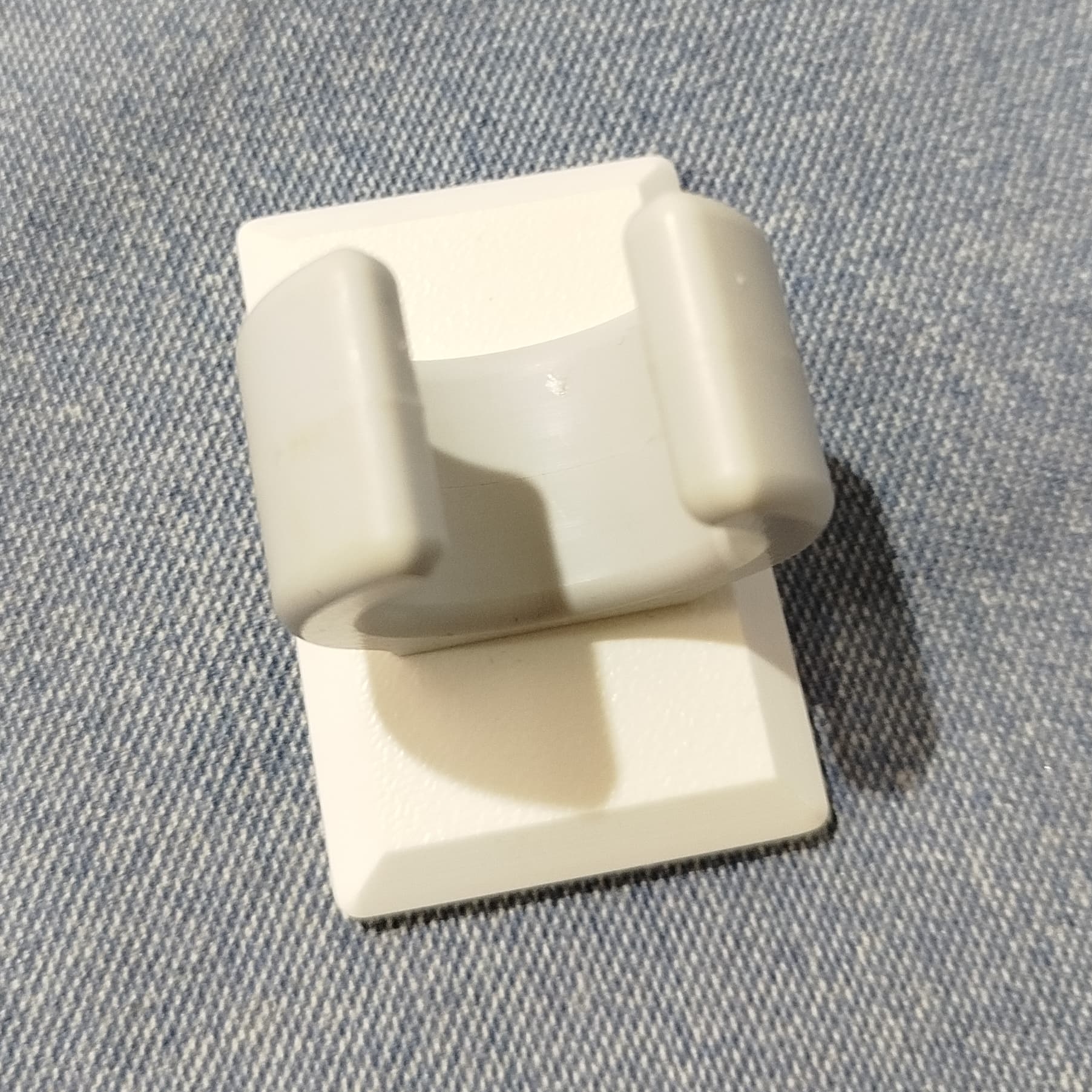 Suporte de plástico branco sobre tecido azul claro tipo ganga