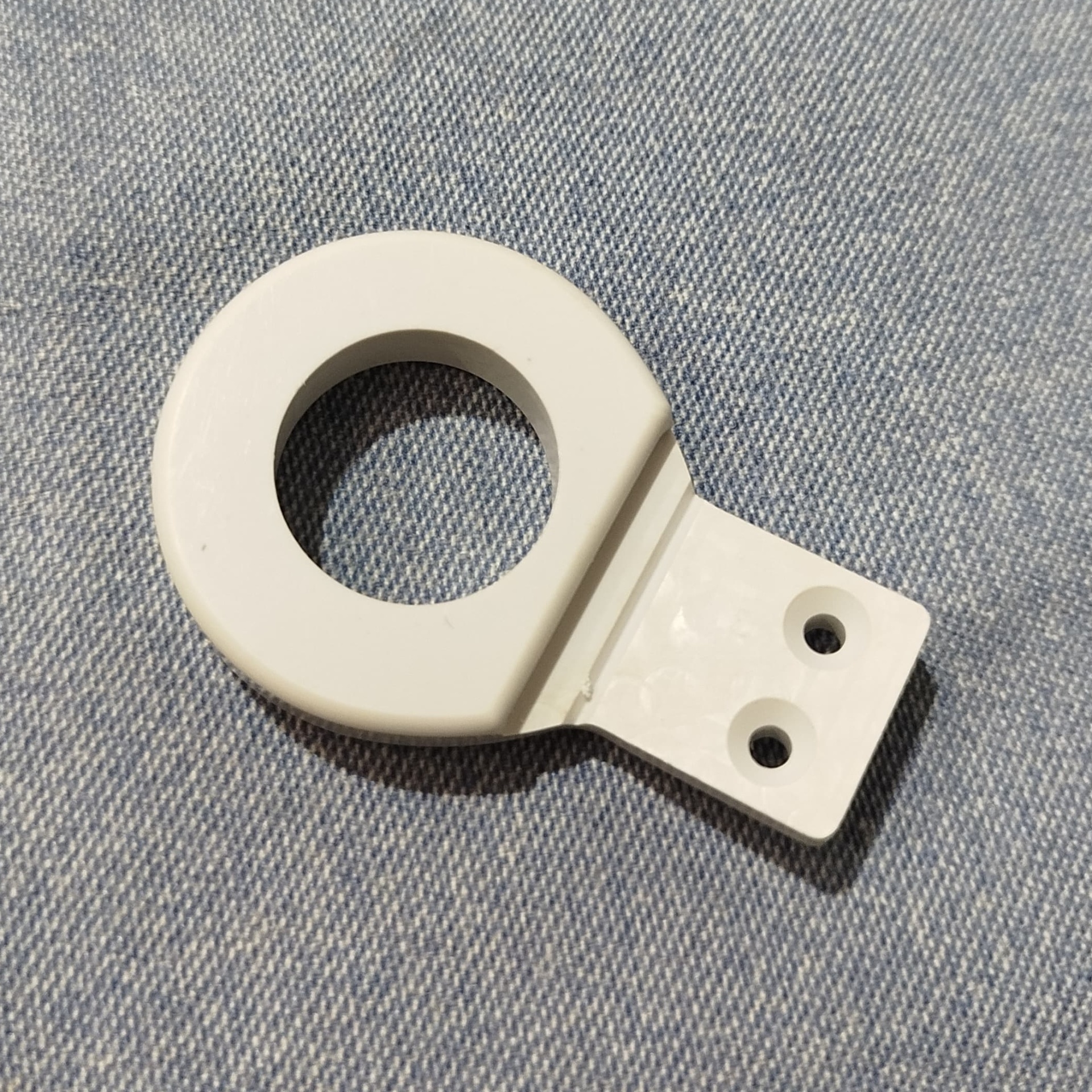 Peça plástica branca circular com dois orifícios em fundo de tecido azul-claro