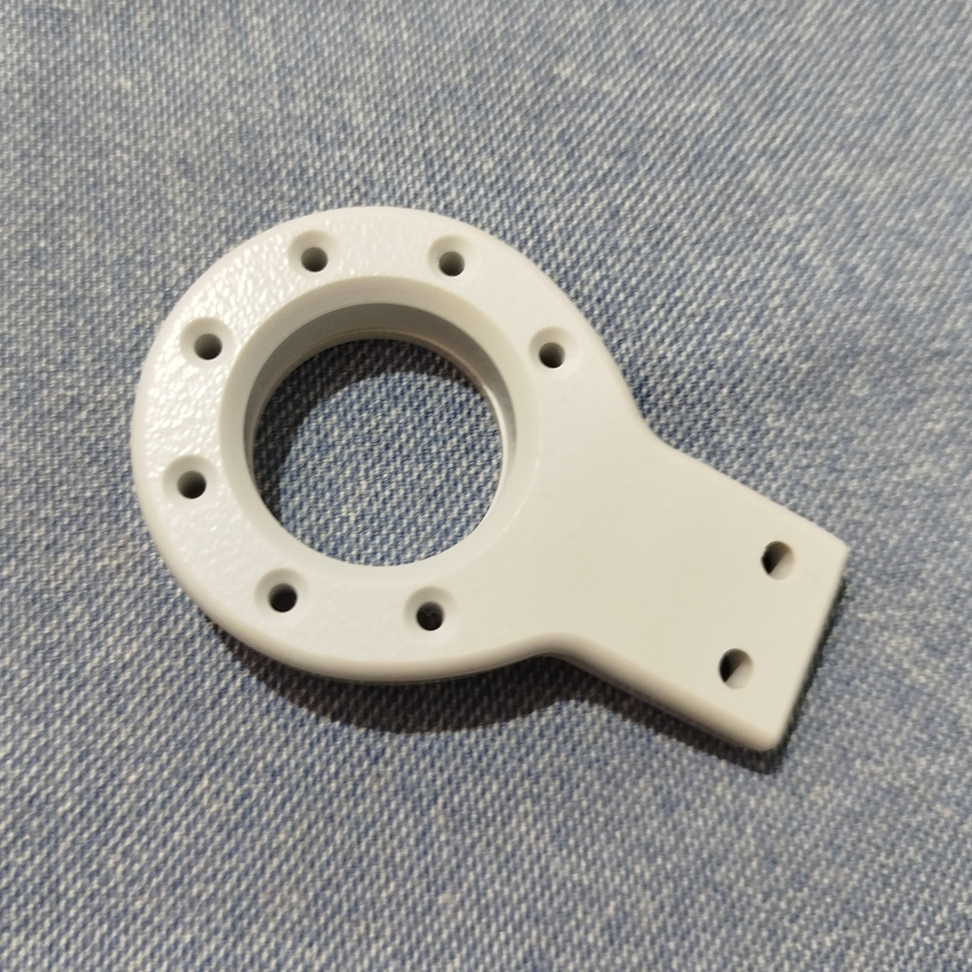 Peça plástica branca circular com furos em tecido azul claro